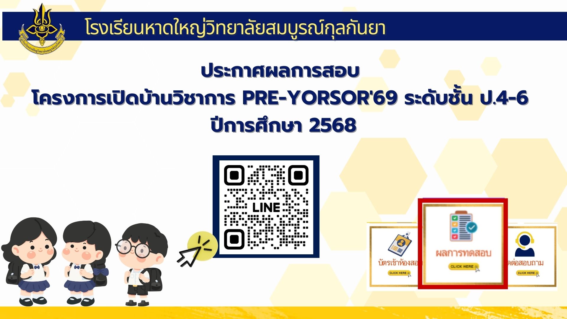 ประกาศผลการสอบโครงการเปิดบ้านวิชาการ PRE-YORSOR'69 ระดับชั้น ป.4-6 ปีการศึกษา 2568