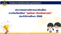 ประกาศผลการพิจารณาคัดเลือก รางวัลเกียรติยศ “กุลกันยา ต้นกล้าเยาวชน” ประจำปีการศึกษา 2568