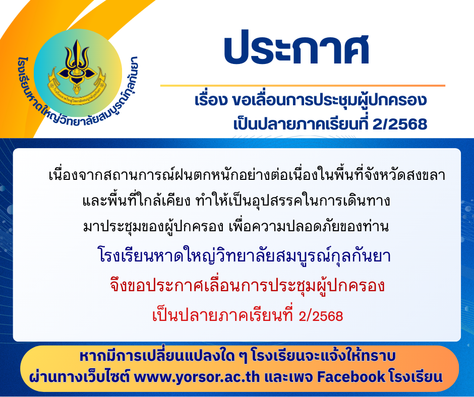 ประกาศ ขอเลื่อนการประชุมผู้ปกครองเป็นปลายภาคเรียนที่ 2/2568