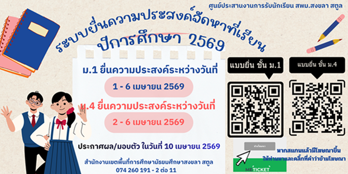 การมอบตัวนักเรียนเพื่อเข้าเรียนชั้นมัธยมศึกษาปีที่ 1 และชั้นมัธยมศึกษาปีที่ 4 ปีการศึกษา 2569